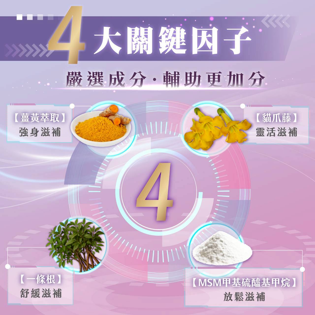◆ 嚴選4大關鍵因子:薑黃萃取、貓爪藤、一條根、MSM甲基硫醯基甲烷,舒緩放鬆,生活更有行動力。